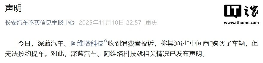 IT之家 11 月 11 日消息,阿维塔科技、深蓝汽车 11 月 10 日晚发布声明,收到消费者投诉,称其通过“中间商”购买了车辆,但无法按约提车,可能遭受损失。